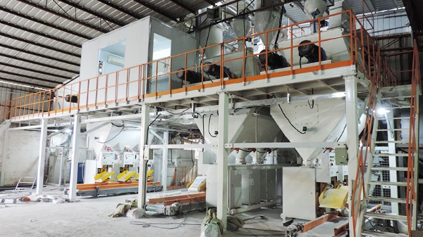 本设备为全自动生产线,双飞粉、灰钙、白水泥等主要原料均为散装,存放于原料罐。除添加剂等小料外,主要原料均采用电脑计量进行自动配料,无需人工投料,避免了因人工配料而出现的产品质量不稳定等问题。,